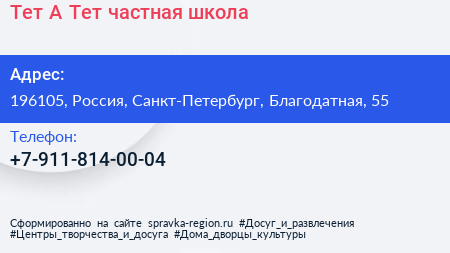 Тет-А-Тет, частная школа по адресу 196105, Россия, Санкт-Петербург, Благодатная, 55 в дальнейшем Организация, размещена в следующих категориях: