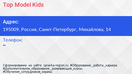 Top Model Kids по адресу 195009, Россия, Санкт-Петербург, Михайлова, 14 в дальнейшем Организация, размещена в следующих категориях: