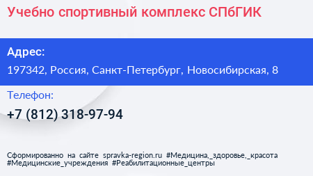 Учебно-спортивный комплекс, СПбГИК по адресу 197342, Россия, Санкт-Петербург, Новосибирская, 8 в дальнейшем Организация, размещена в следующих категориях: