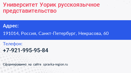 Университет Уорик, русскоязычное представительство по адресу 191014, Россия, Санкт-Петербург, Некрасова, 60 в дальнейшем Организация, размещена в следующих категориях: