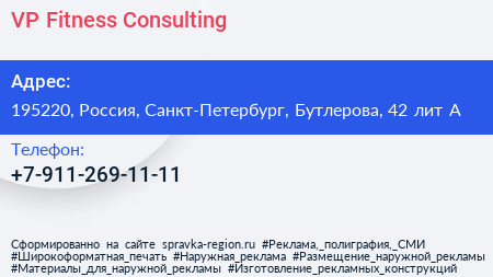 VP Fitness Consulting по адресу 195220, Россия, Санкт-Петербург, Бутлерова, 42 лит А в дальнейшем Организация, размещена в следующих категориях: