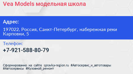 Vea Models, модельная школа по адресу 197022, Россия, Санкт-Петербург, набережная реки Карповки, 5 в дальнейшем Организация, размещена в следующих категориях: