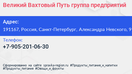 Великий Вахтовый Путь, группа предприятий по адресу 191167, Россия, Санкт-Петербург, Александра Невского, 9 в дальнейшем Организация, размещена в следующих категориях: