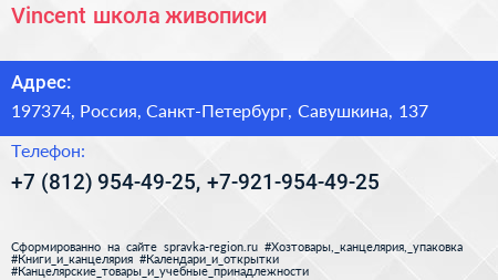 Vincent, школа живописи по адресу 197374, Россия, Санкт-Петербург, Савушкина, 137 в дальнейшем Организация, размещена в следующих категориях:
