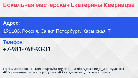 Вокальная мастерская Екатерины Квернадзе по адресу 191186, Россия, Санкт-Петербург, Казанская, 7 в дальнейшем Организация, размещена в следующих категориях: