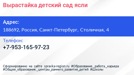 Вырастайка, детский сад-ясли по адресу 188692, Россия, Санкт-Петербург, Столичная, 4 в дальнейшем Организация, размещена в следующих категориях:
