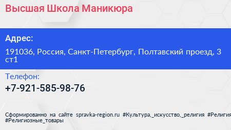 Высшая Школа Маникюра по адресу 191036, Россия, Санкт-Петербург, Полтавский проезд, 3 ст1 в дальнейшем Организация, размещена в следующих категориях: