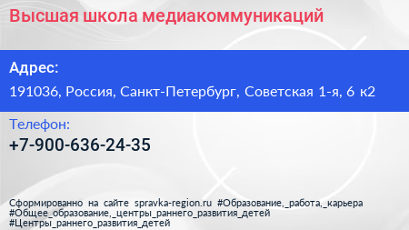 Высшая школа медиакоммуникаций по адресу 191036, Россия, Санкт-Петербург, Советская 1-я, 6 к2 в дальнейшем Организация, размещена в следующих категориях: