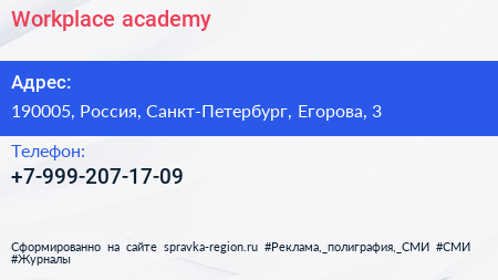 Workplace academy по адресу 190005, Россия, Санкт-Петербург, Егорова, 3 в дальнейшем Организация, размещена в следующих категориях: