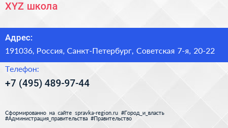 XYZ, школа по адресу 191036, Россия, Санкт-Петербург, Советская 7-я, 20-22 в дальнейшем Организация, размещена в следующих категориях: