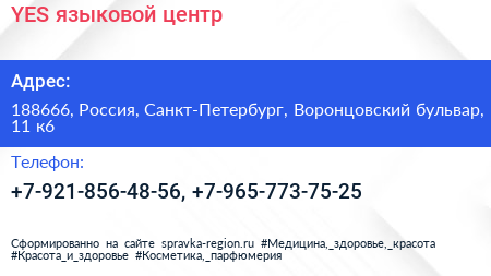YES, языковой центр по адресу 188666, Россия, Санкт-Петербург, Воронцовский бульвар, 11 к6 в дальнейшем Организация, размещена в следующих категориях: