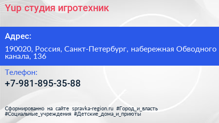 Yup, студия игротехник по адресу 190020, Россия, Санкт-Петербург, набережная Обводного канала, 136 в дальнейшем Организация, размещена в следующих категориях: