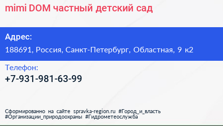 mimi DOM, частный детский сад по адресу 188691, Россия, Санкт-Петербург, Областная, 9 к2 в дальнейшем Организация, размещена в следующих категориях: