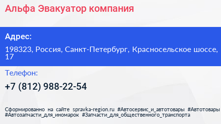 Альфа-Эвакуатор, компания по адресу 198323, Россия, Санкт-Петербург, Красносельское шоссе, 17 в дальнейшем Организация, размещена в следующих категориях: