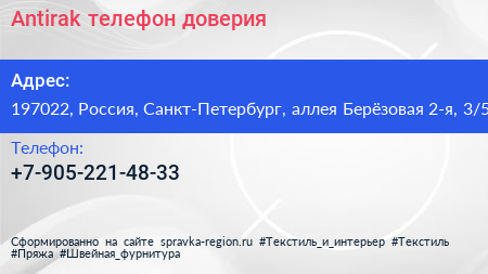 Antirak, телефон доверия по адресу 197022, Россия, Санкт-Петербург, аллея Берёзовая 2-я, 3/5 в дальнейшем Организация, размещена в следующих категориях: