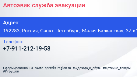 Автоэвик, служба эвакуации по адресу 192283, Россия, Санкт-Петербург, Малая Балканская, 37 к1 в дальнейшем Организация, размещена в следующих категориях: