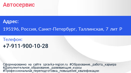 Автосервис по адресу 195196, Россия, Санкт-Петербург, Таллинская, 7 лит Р в дальнейшем Организация, размещена в следующих категориях: