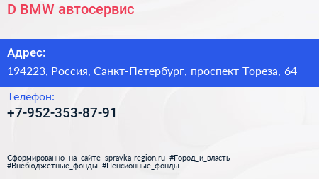 D BMW, автосервис по адресу 194223, Россия, Санкт-Петербург, проспект Тореза, 64 в дальнейшем Организация, размещена в следующих категориях: