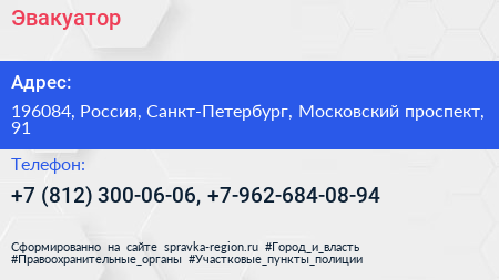 Эвакуатор+ по адресу 196084, Россия, Санкт-Петербург, Московский проспект, 91 в дальнейшем Организация, размещена в следующих категориях: