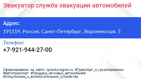 Эвакуатор, служба эвакуации автомобилей по адресу 191119, Россия, Санкт-Петербург, Воронежская, 5 в дальнейшем Организация, размещена в следующих категориях: