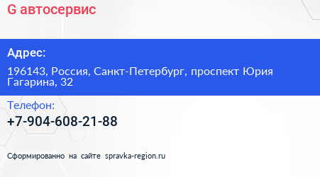 G, автосервис по адресу 196143, Россия, Санкт-Петербург, проспект Юрия Гагарина, 32 в дальнейшем Организация, размещена в следующих категориях: