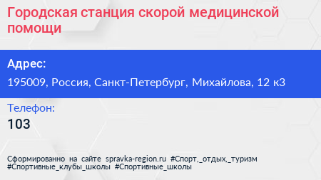 Городская станция скорой медицинской помощи по адресу 195009, Россия, Санкт-Петербург, Михайлова, 12 к3 в дальнейшем Организация, размещена в следующих категориях: