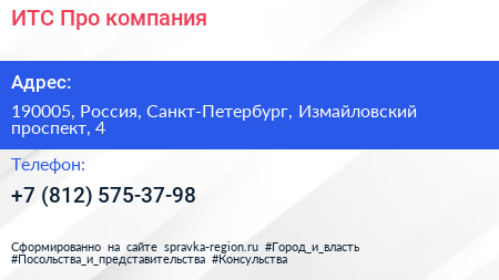 ИТС Про, компания по адресу 190005, Россия, Санкт-Петербург, Измайловский проспект, 4 в дальнейшем Организация, размещена в следующих категориях: