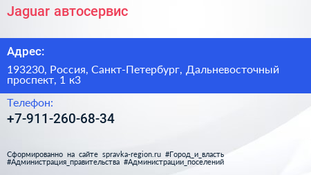 Jaguar, автосервис по адресу 193230, Россия, Санкт-Петербург, Дальневосточный проспект, 1 к3 в дальнейшем Организация, размещена в следующих категориях: