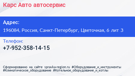 Карс Авто, автосервис по адресу 196084, Россия, Санкт-Петербург, Цветочная, 6 лит З в дальнейшем Организация, размещена в следующих категориях: