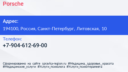 Porsche по адресу 194100, Россия, Санкт-Петербург, Литовская, 10 в дальнейшем Организация, размещена в следующих категориях: