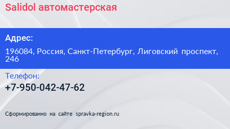 Salidol, автомастерская по адресу 196084, Россия, Санкт-Петербург, Лиговский проспект, 246 в дальнейшем Организация, размещена в следующих категориях: