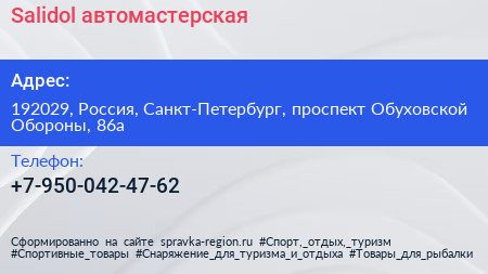 Salidol, автомастерская по адресу 192029, Россия, Санкт-Петербург, проспект Обуховской Обороны, 86а в дальнейшем Организация, размещена в следующих категориях: