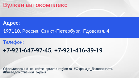 Вулкан, автокомплекс по адресу 197110, Россия, Санкт-Петербург, Гдовская, 4 в дальнейшем Организация, размещена в следующих категориях: