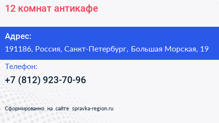 12 комнат, антикафе по адресу 191186, Россия, Санкт-Петербург, Большая Морская, 19 в дальнейшем Организация, размещена в следующих категориях: