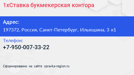 1хСтавка, букмекерская контора по адресу 197372, Россия, Санкт-Петербург, Ильюшина, 3 к1 в дальнейшем Организация, размещена в следующих категориях: