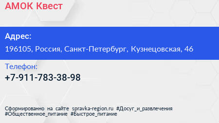 АМОК Квест по адресу 196105, Россия, Санкт-Петербург, Кузнецовская, 46 в дальнейшем Организация, размещена в следующих категориях: