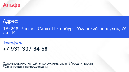 Альфа по адресу 195248, Россия, Санкт-Петербург, Уманский переулок, 76 лит К в дальнейшем Организация, размещена в следующих категориях: