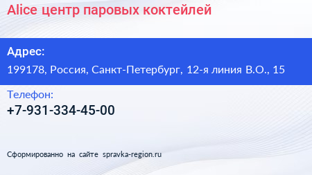 Alice, центр паровых коктейлей по адресу 199178, Россия, Санкт-Петербург, 12-я линия В.О., 15 в дальнейшем Организация, размещена в следующих категориях: