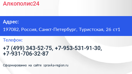 Алкополис24 по адресу 197082, Россия, Санкт-Петербург, Туристская, 26 ст1 в дальнейшем Организация, размещена в следующих категориях: