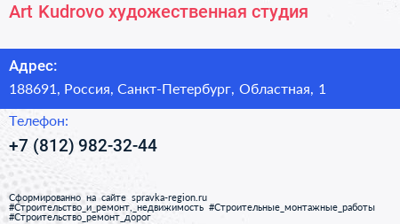 Art Kudrovo, художественная студия по адресу 188691, Россия, Санкт-Петербург, Областная, 1 в дальнейшем Организация, размещена в следующих категориях: