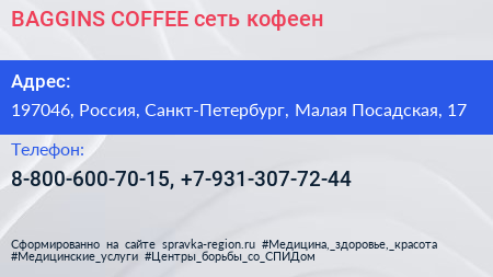 BAGGINS COFFEE, сеть кофеен по адресу 197046, Россия, Санкт-Петербург, Малая Посадская, 17 в дальнейшем Организация, размещена в следующих категориях: