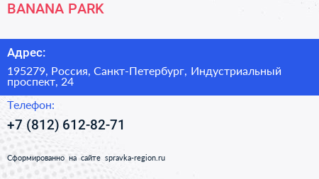 BANANA PARK по адресу 195279, Россия, Санкт-Петербург, Индустриальный проспект, 24 в дальнейшем Организация, размещена в следующих категориях: