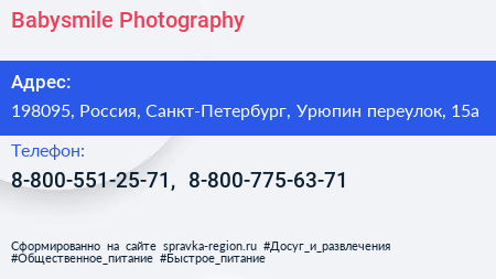 Babysmile Photography по адресу 198095, Россия, Санкт-Петербург, Урюпин переулок, 15а в дальнейшем Организация, размещена в следующих категориях: