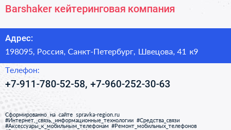 Barshaker, кейтеринговая компания по адресу 198095, Россия, Санкт-Петербург, Швецова, 41 к9 в дальнейшем Организация, размещена в следующих категориях: