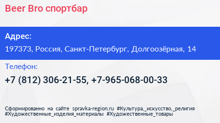 Beer Bro, спортбар по адресу 197373, Россия, Санкт-Петербург, Долгоозёрная, 14 в дальнейшем Организация, размещена в следующих категориях: