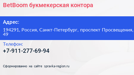 BetBoom, букмекерская контора по адресу 194291, Россия, Санкт-Петербург, проспект Просвещения, 49 в дальнейшем Организация, размещена в следующих категориях: