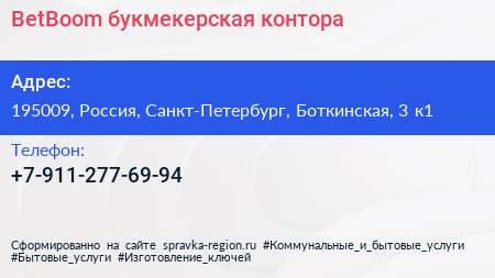 BetBoom, букмекерская контора по адресу 195009, Россия, Санкт-Петербург, Боткинская, 3 к1 в дальнейшем Организация, размещена в следующих категориях: