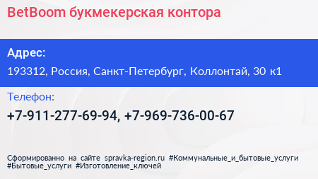BetBoom, букмекерская контора по адресу 193312, Россия, Санкт-Петербург, Коллонтай, 30 к1 в дальнейшем Организация, размещена в следующих категориях: