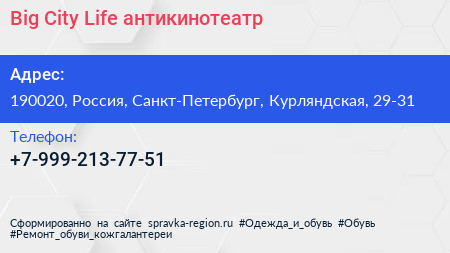 Big City Life, антикинотеатр по адресу 190020, Россия, Санкт-Петербург, Курляндская, 29-31 в дальнейшем Организация, размещена в следующих категориях: