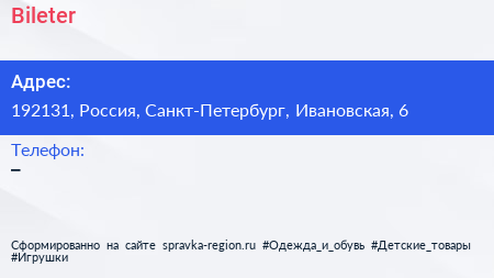 Bileter по адресу 192131, Россия, Санкт-Петербург, Ивановская, 6 в дальнейшем Организация, размещена в следующих категориях: